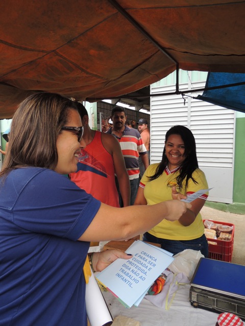 Na ocasião, diversos cartazes foram afixados nas proximidades da feira de frutas e verduras. Também foram entregues panfletos as crianças e adultos, para o esclarecimento das leis que proíbem a exploração do trabalho infantil.