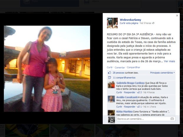 A brasileira acusa o ex-marido, Patrick Joseph Galvin, de ter cometido crime sexual contra a menina. No entanto, sem comunicar à Justiça, ela mudou-se da Flórida para o Texas com a filha, impedindo que o pai a visitasse e acabou detida por não obedecer à determinação. Nesta quinta, a Corte também informou que uma nova audiência, marcada para 26 de março, vai avaliar a situação de Karla. A Justiça ainda ordenou que Patrick seja avaliado por um psicólogo indicado pelo estado.